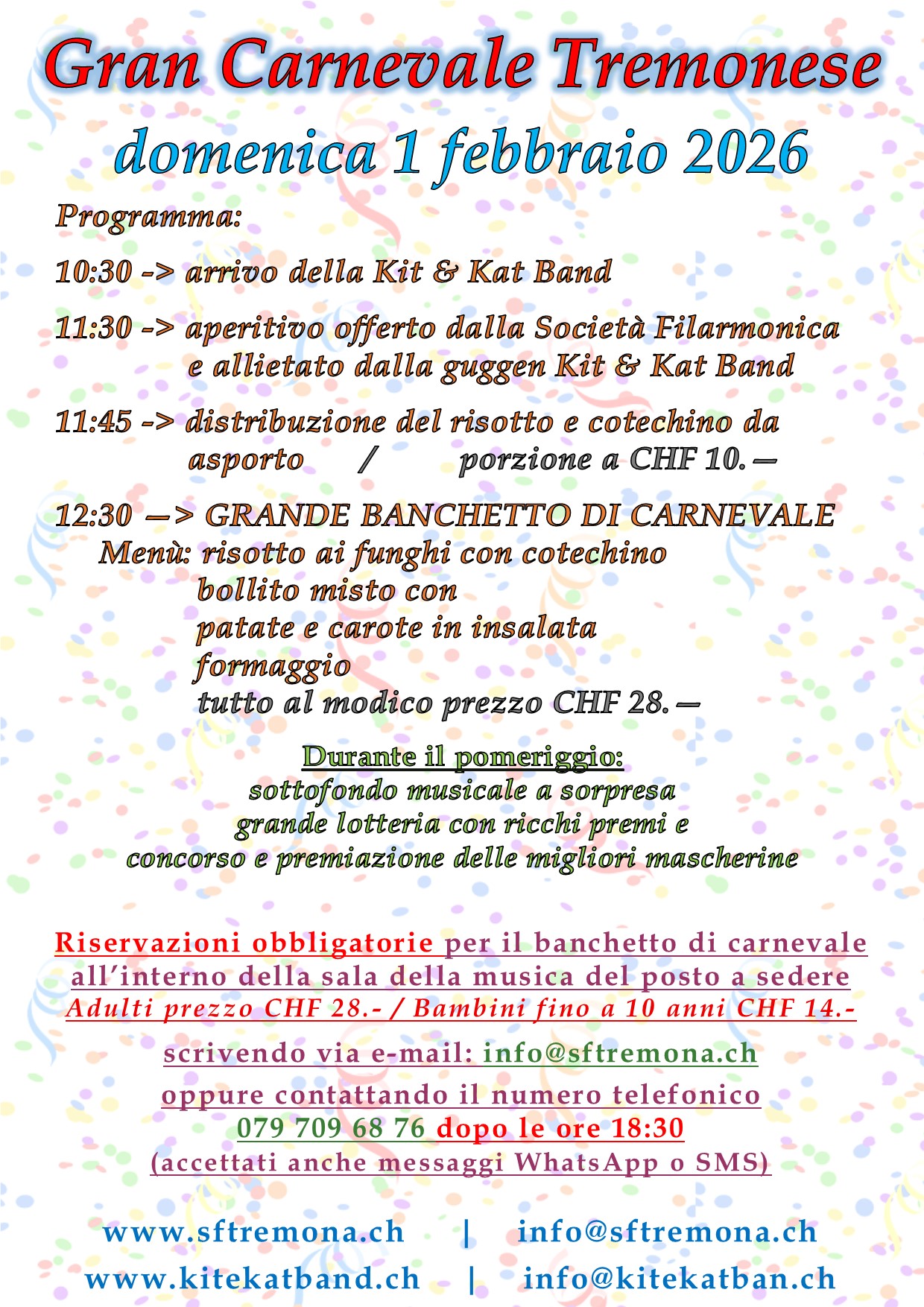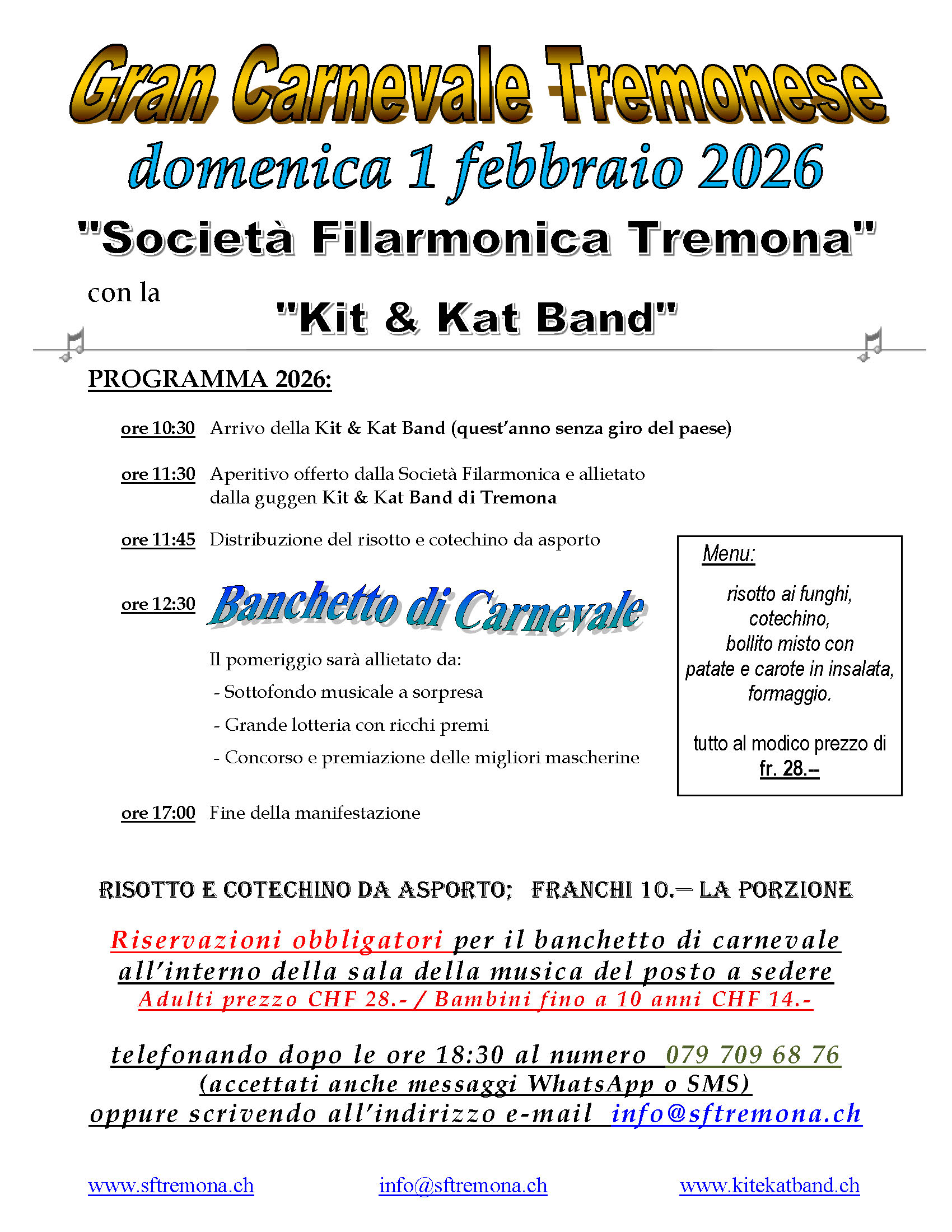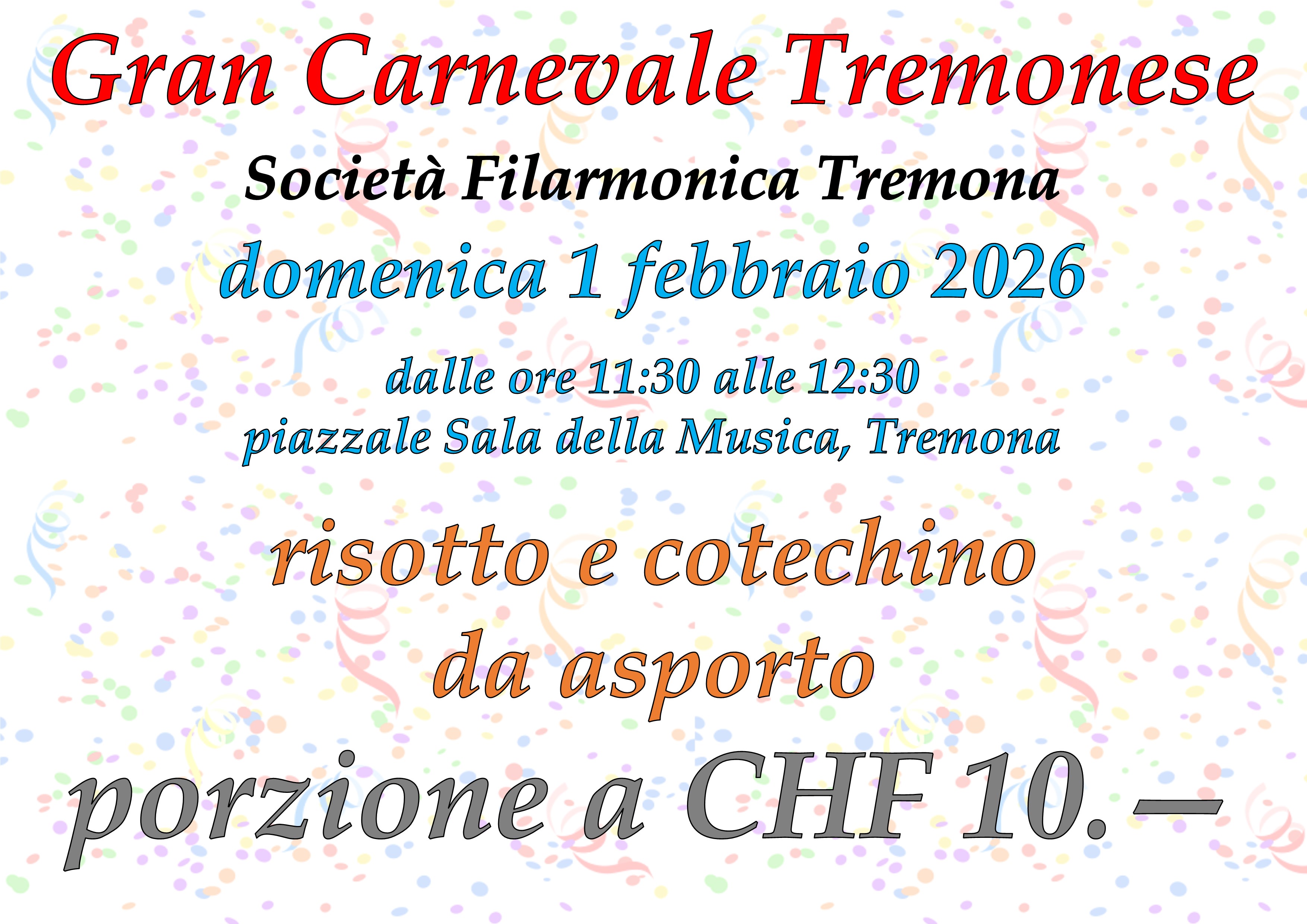 domenica 20.02.2022 - Carnevale 2022 risotto e cotechino da asporto, Per prenotazioni chiamate il 091 646 01 20 o scrivete all’indirizzo e-mail: Questo indirizzo email è protetto dagli spambots. È necessario abilitare JavaScript per vederlo. La distribuzione avverrà domenica 20 febbraio 2022 dalle ore 11:30 alle 12:30 piazzale davanti alla Sala della Musica della Società Filarmonica di Tremona. Ricordatevi di portare il vostro contenitore!!!