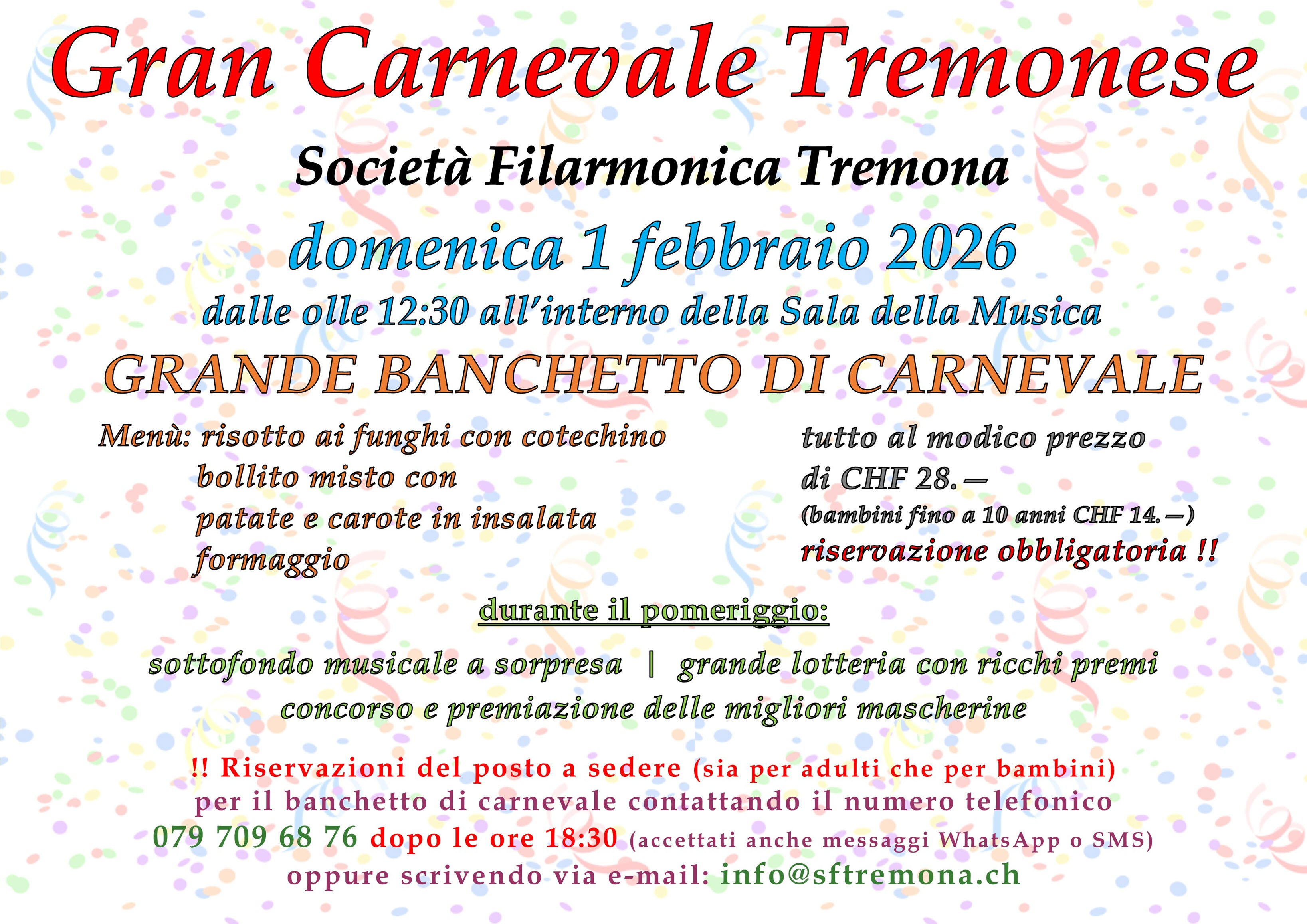 domenica 20.02.2022 - Carnevale 2022 risotto e cotechino da asporto, Per prenotazioni chiamate il 091 646 01 20 o scrivete all’indirizzo e-mail: Questo indirizzo email è protetto dagli spambots. È necessario abilitare JavaScript per vederlo. La distribuzione avverrà domenica 20 febbraio 2022 dalle ore 11:30 alle 12:30 piazzale davanti alla Sala della Musica della Società Filarmonica di Tremona. Ricordatevi di portare il vostro contenitore!!!